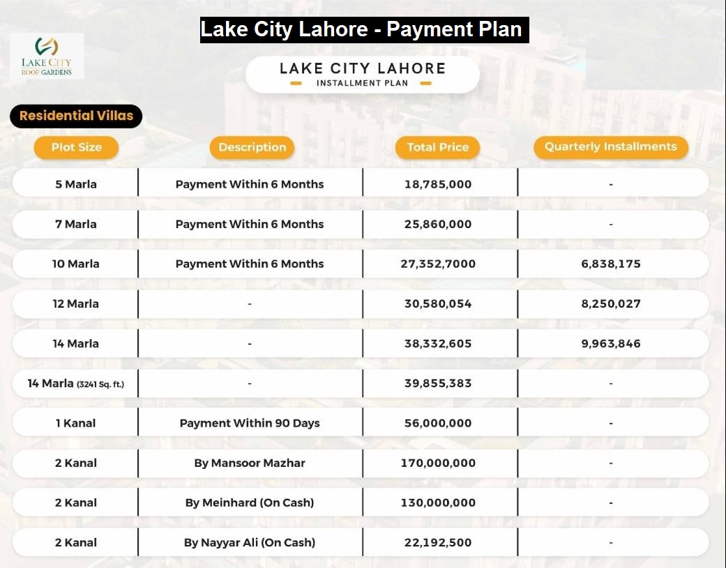 Lake City offers flexible installment plans for both residential and commercial plots. Prices vary depending on sector, plot size, and location (corner, park-facing, main boulevard).